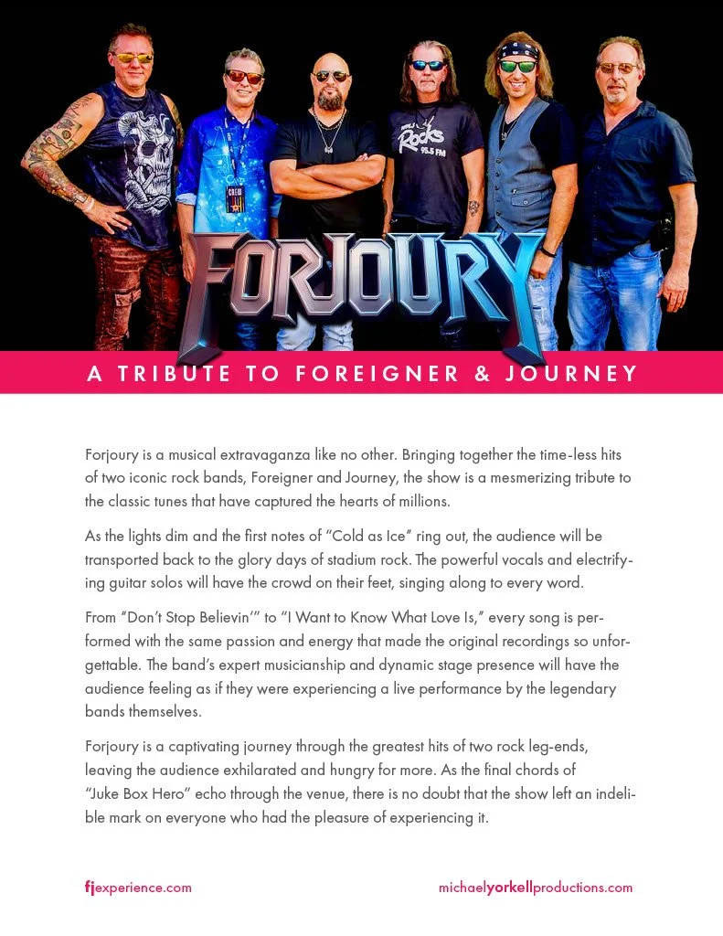 Forjoury is a musical extravaganza like no other. Bringing together the timeless hits of two iconic rock bands, Foreigner and Journey, the show is a mesmerizing tribute to the classic tunes that have captured the hearts of millions.